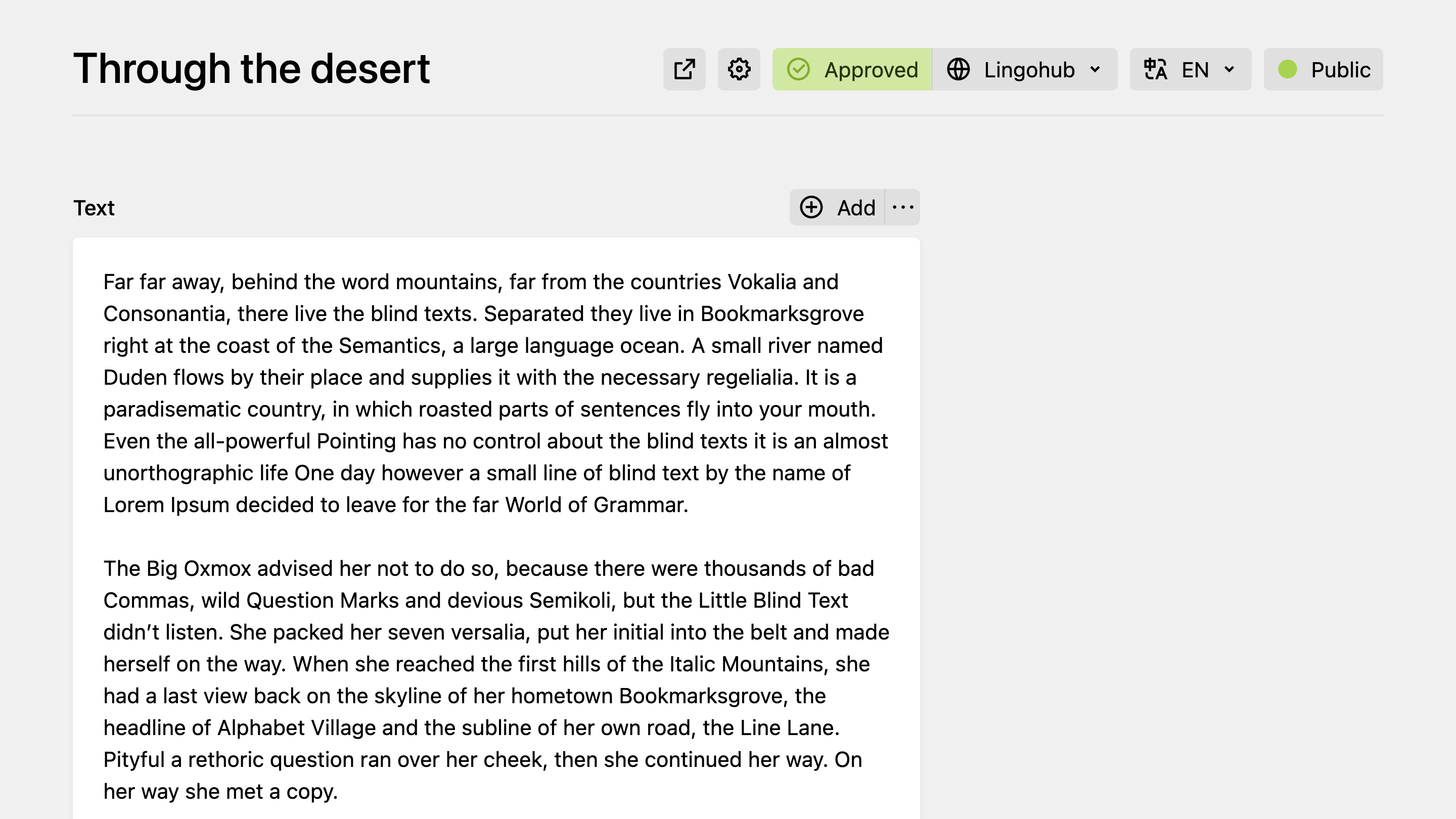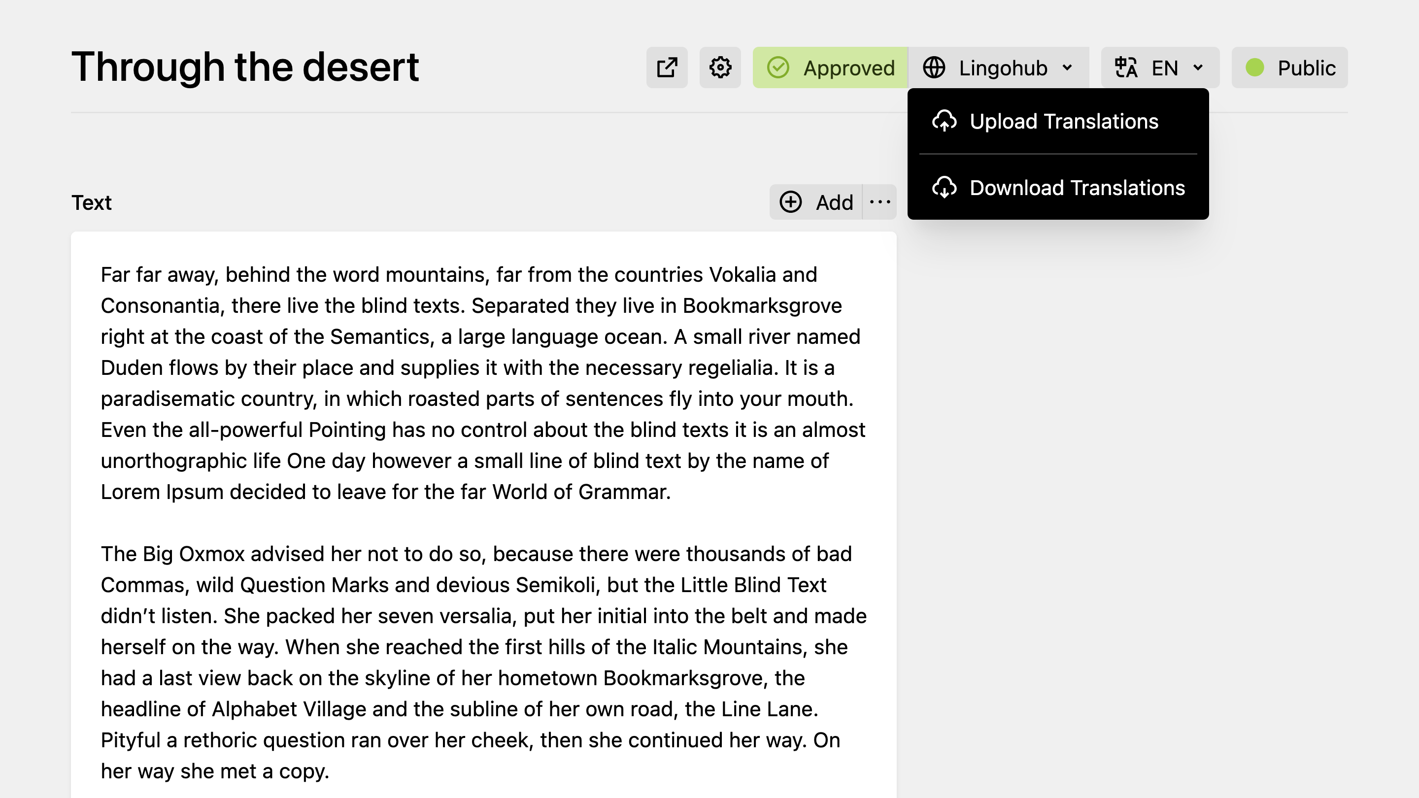 The translation status is automatically retrieved from Lingohub and displayed in the user interface. It shows the minimum status of all segments of the page. Only if all segments are in status Approved, the translation language will be shown as Approved in green color: