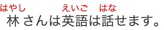 <ruby><rb>林</rb><rp>(</rp><rt>はやし</rt><rp>)</rp></ruby>さんは<ruby><rb>英語</rb><rp>(</rp><rt>えいご</rt><rp>)</rp></ruby>は<ruby><rb>話</rb><rp>(</rp><rt>はな</rt><rp>)</rp></ruby>せます。