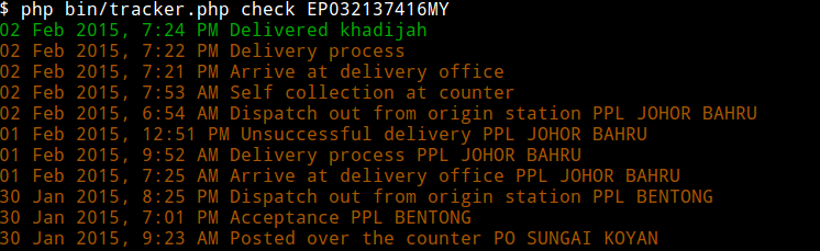 <? use k4ml\postrack\Parcel; $parcel = new Parcel('EM61871881MY'); print_r($parcel->check()); ?>