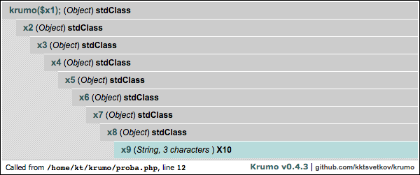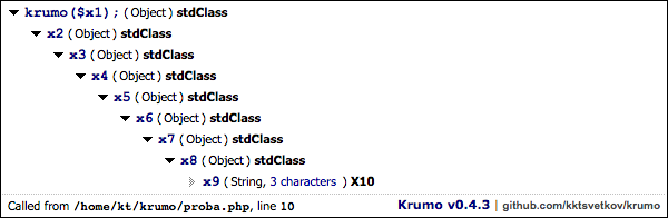 $x1->x2->x3->x4->x5->x6->x7->x8->x9 = 'X10'; krumo($x1);