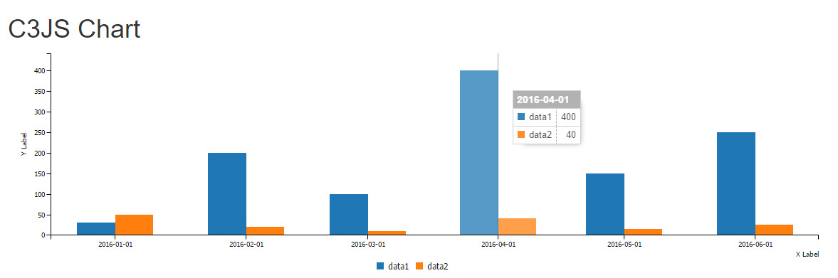 use kongoon\c3js\C3JS; echo C3JS::widget([ 'options' => [ 'data' => [ 'x' => 'x', 'columns' => [ ['x', '2016-01-01', '2016-02-01', '2016-03-01', '2016-04-01', '2016-05-01', '2016-06-01'], ['data1', 30, 200, 100, 400, 150, 250], ['data2', 50, 20, 10, 40, 15, 25] ], 'types' => [ 'data1' => 'bar', 'data2' => 'bar' ], ], 'axis' => [ 'y' => [ 'label' => [ 'text' => 'Y Label', 'position' => 'outer-middle', ] ], 'x' => [ 'type' => 'timeseries', 'tick' => [ 'format' => '%Y-%m-%d' ], 'label' => [ 'text' => 'X Label', 'position' => 'outer-middle', ] ] ] ], ]);
