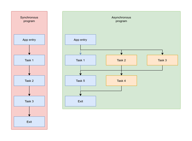 This diagram shows the difference between synchronous and asynchronous programs. First ones executing every task in the main process so if you have a task like get a huge file from a website - the program will be paused (lagged) until this task will be not finished. It also means that other tasks in your program will be executed only after this one
