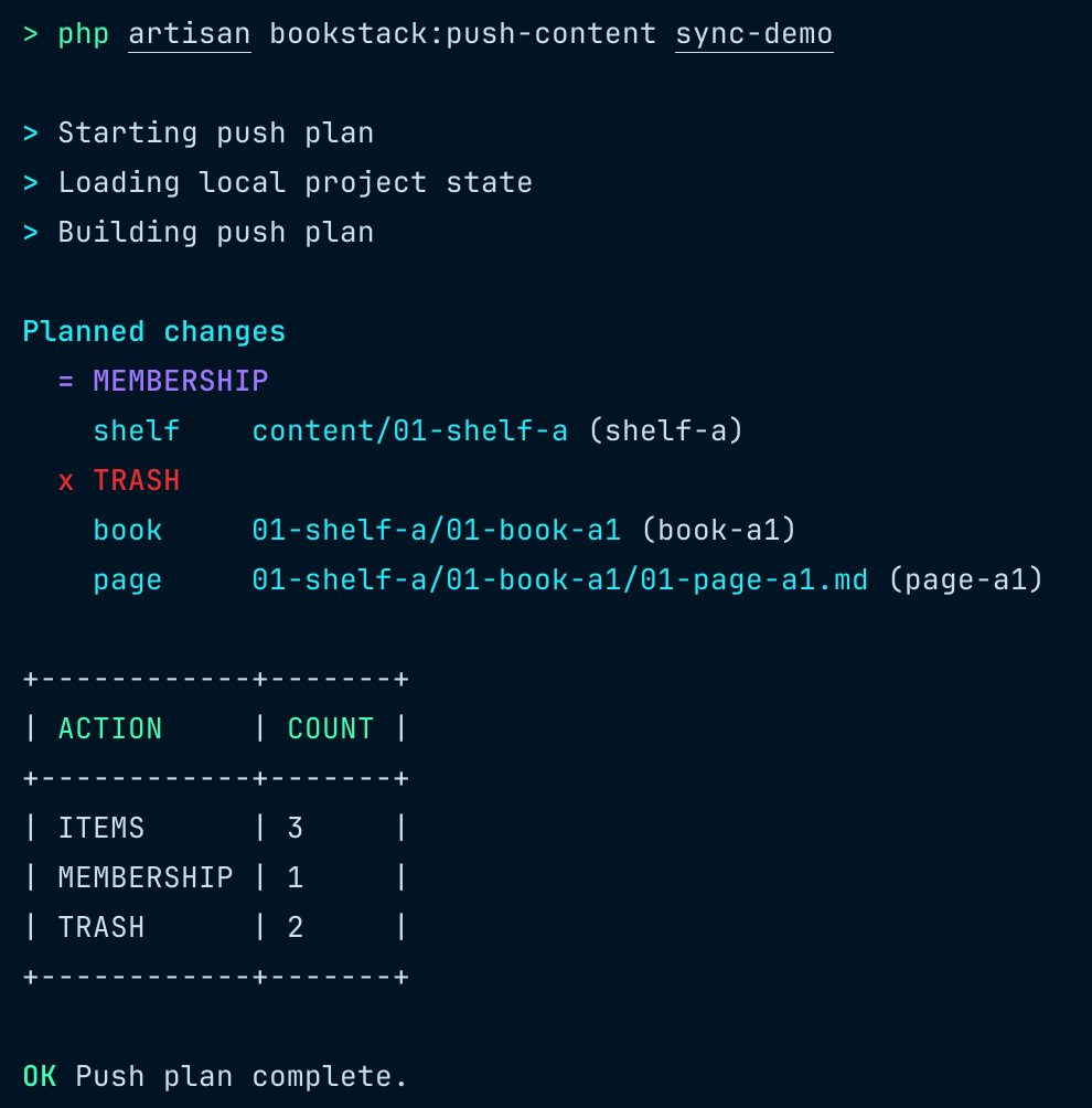 bookstack:push-contentbuilds the current local state.- It compares this state with the previous