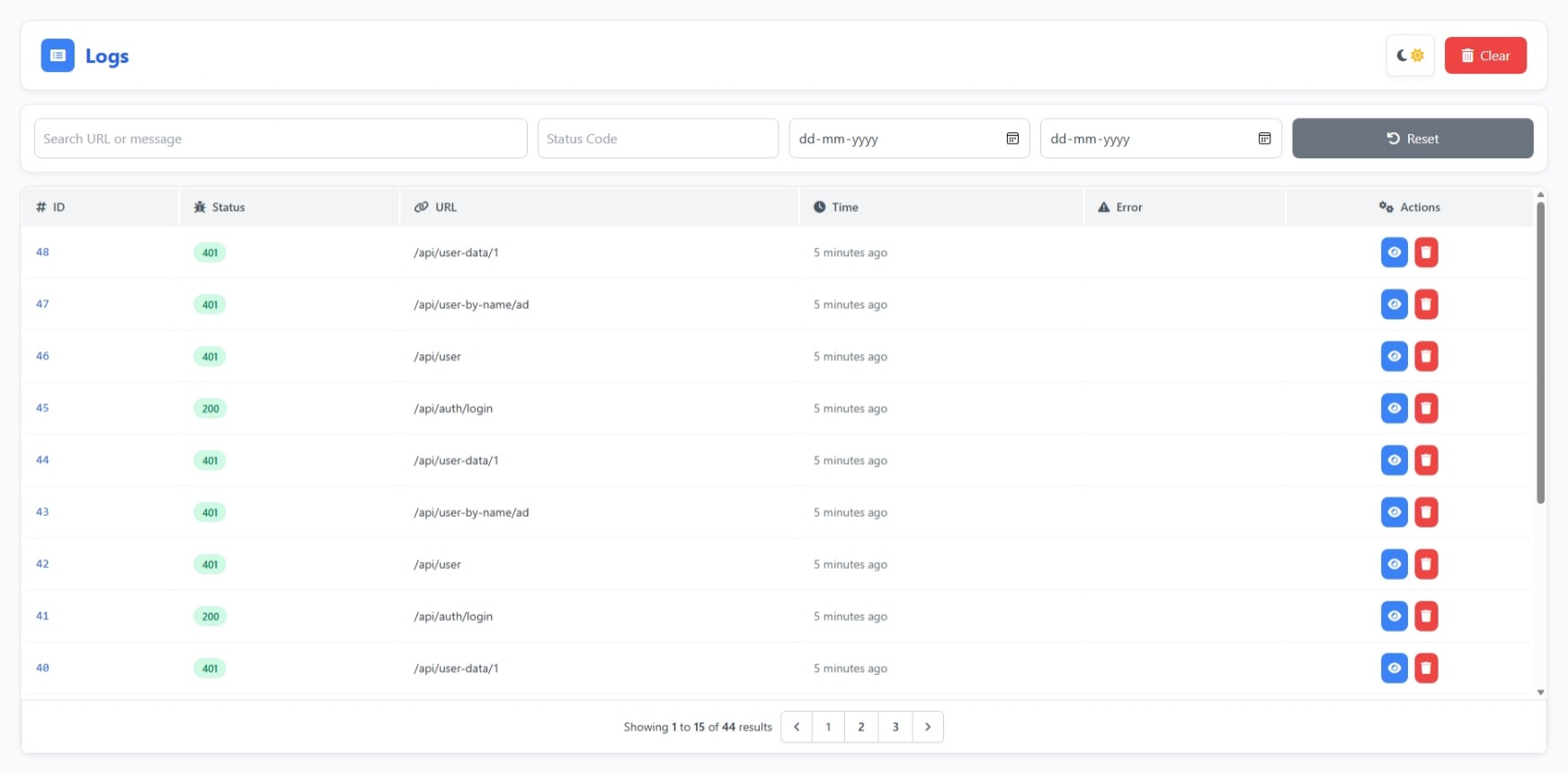 - Filter by method, status, or message