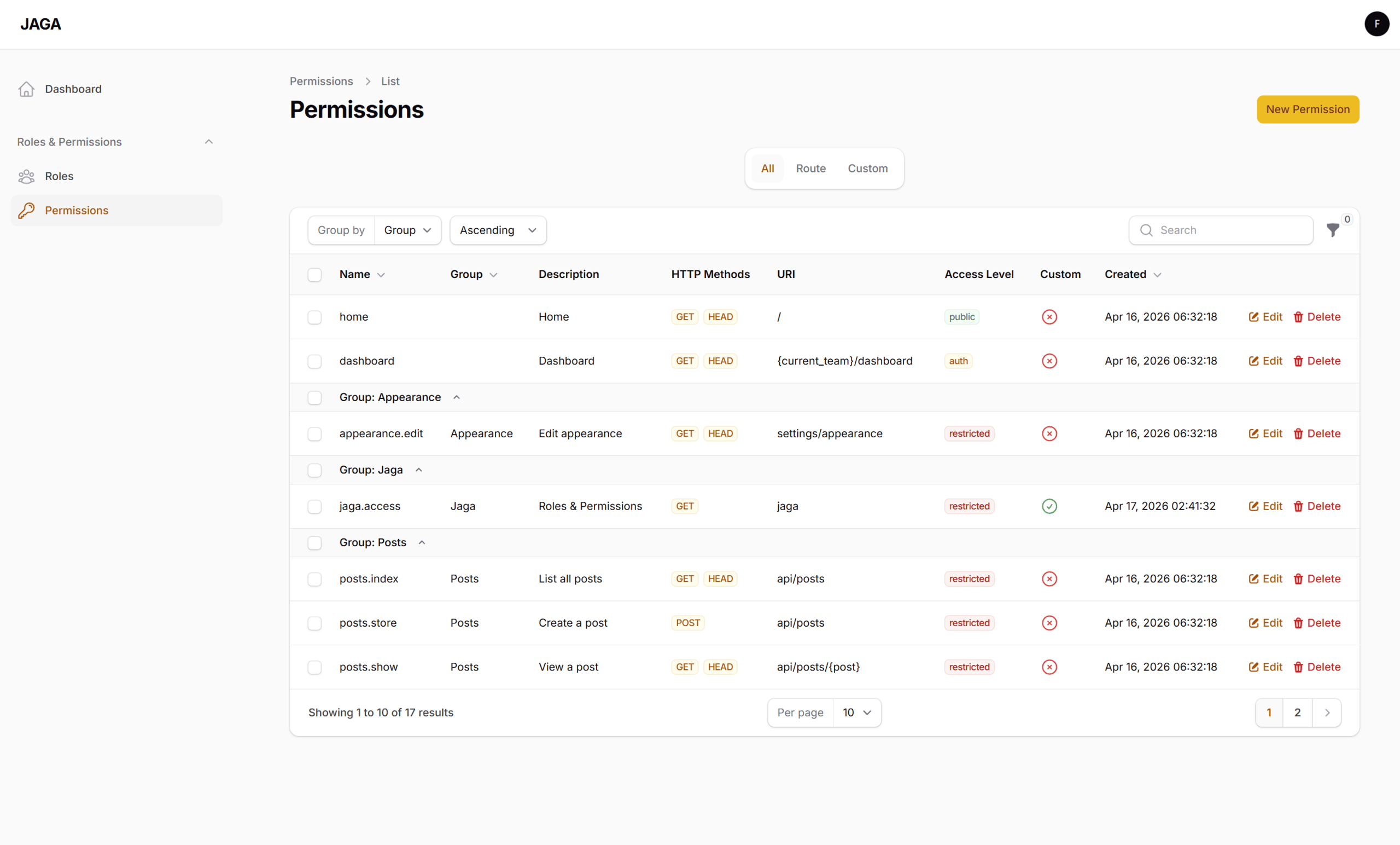 - Tabs — switch between All, Route (auto-discovered), and Custom permissions