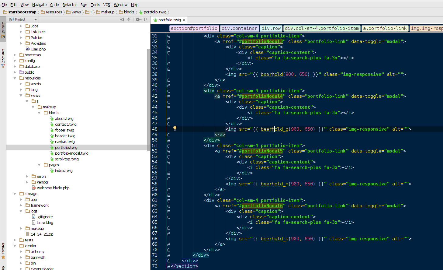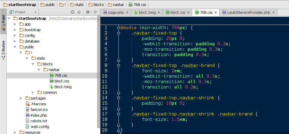 ###Оговорка: Чтобы не отвлекаться на верстку, в качестве примера возьмем готовый шаблон START BOOTSTRAP, разобьем на блоки и покажем как правильно организовывать код и статику. Для того, чтобы было проще работать и иметь возможность сборки страницы из кусочков воспользуемся шаблонизатором Twig. Сразу обращу внимание на то, что на выходе мы получим примерно такую страницу со ссылками на сгенерированные страницы и блоки, причем для каждой темы оформления, т.е. можно будет таким образом верстать для проектов хоть с использованием Laravel, хоть Joomla.