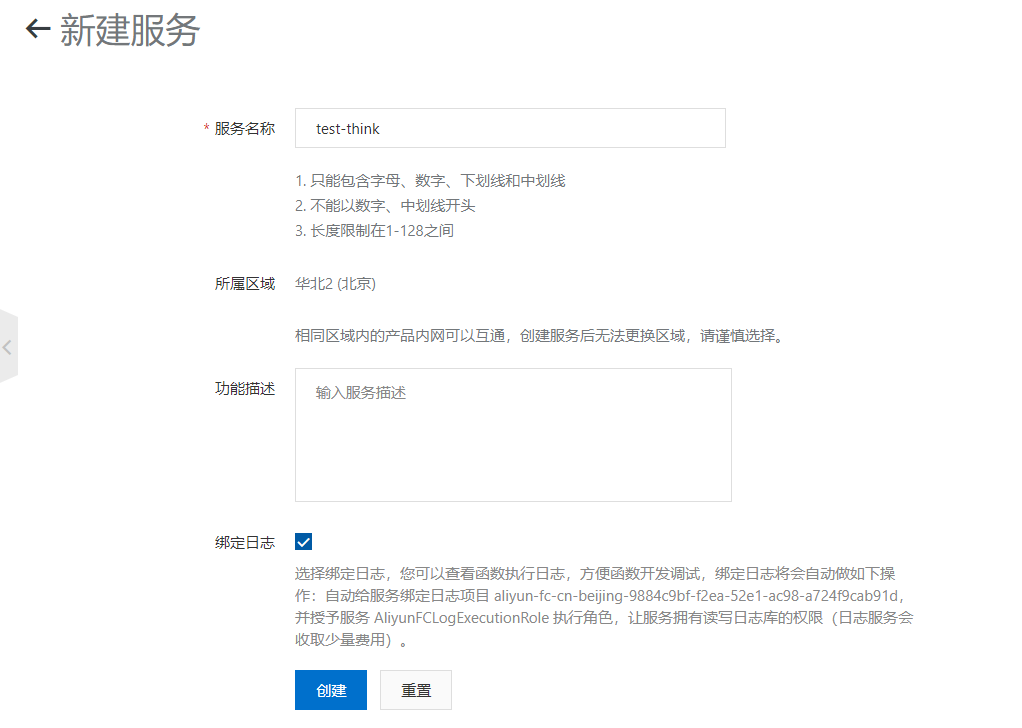 输入名称test-think,可选择绑定日志,点击创建。