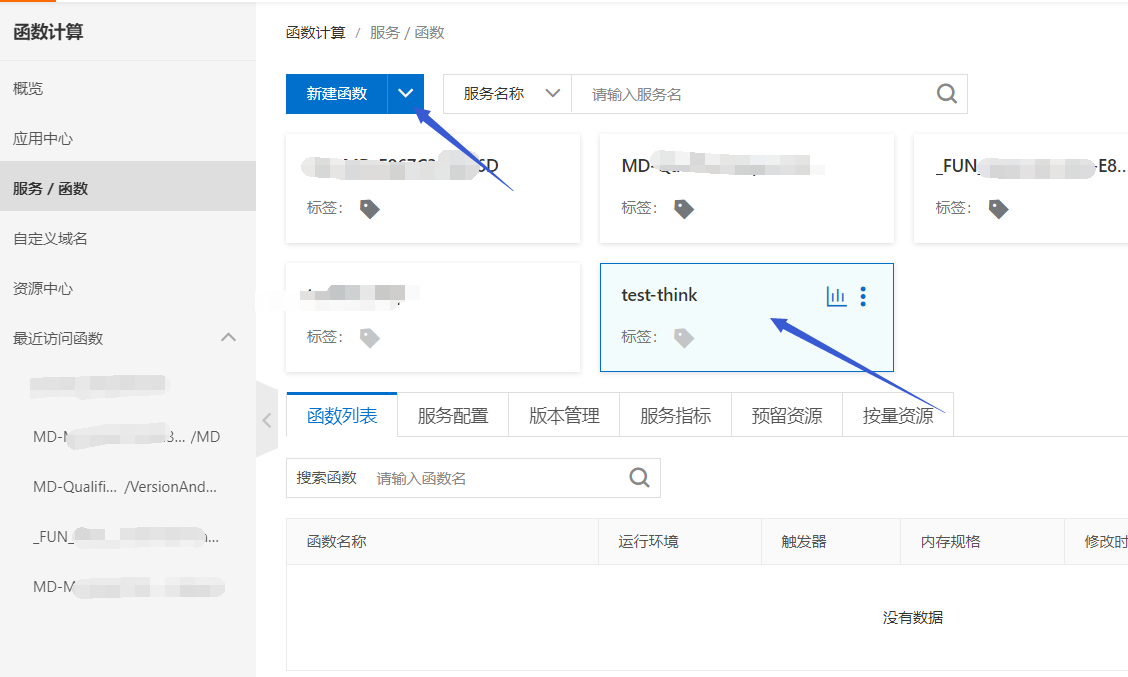在上个步骤中创建的test-think服务器下创建一个函数fc