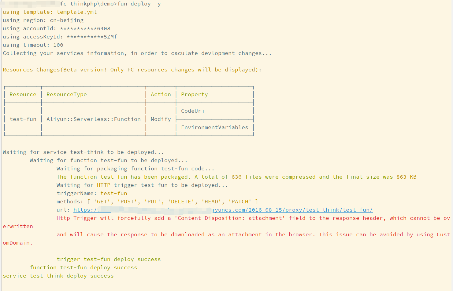 执行部署命令(权限策略配置请参考阿里云相关文档):