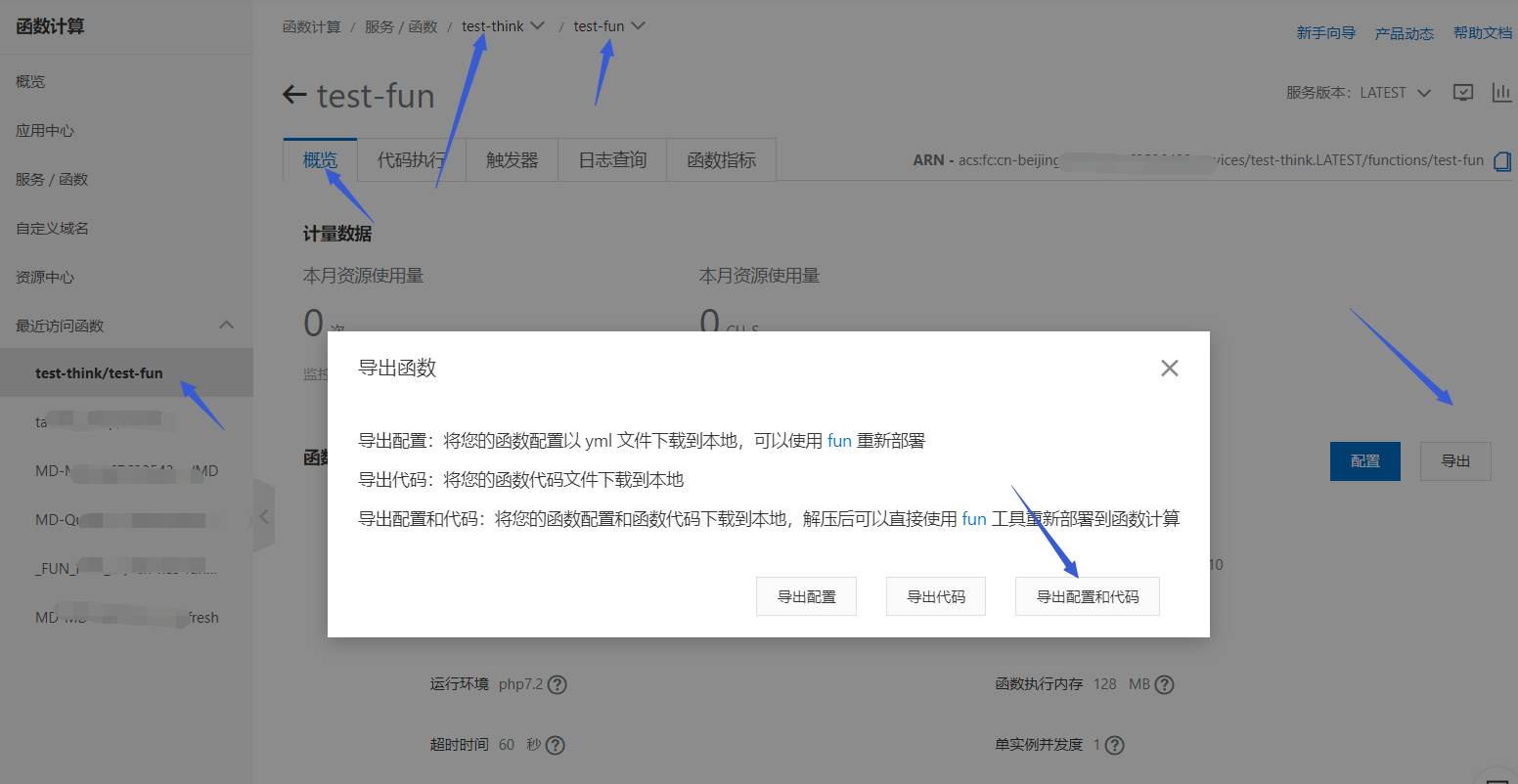 回到第4步创建的函数test-fun概览界面,点击导出,选择导出配置和代码。