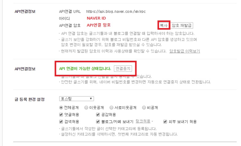 NAVER Blog 설정에서 API연결 암호를 얻습니다.