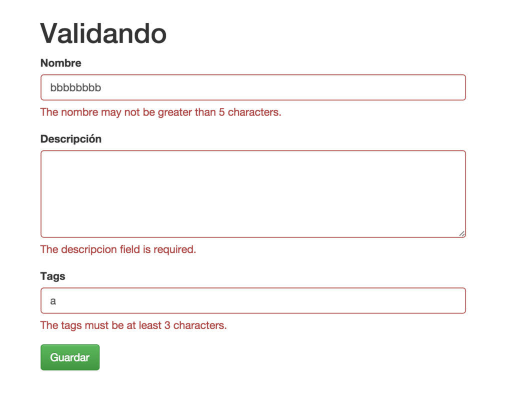 public function rules() { return [ 'name'=>'required|max:5', 'description'=>'required', 'tags'=>'required|min:3', ]; }