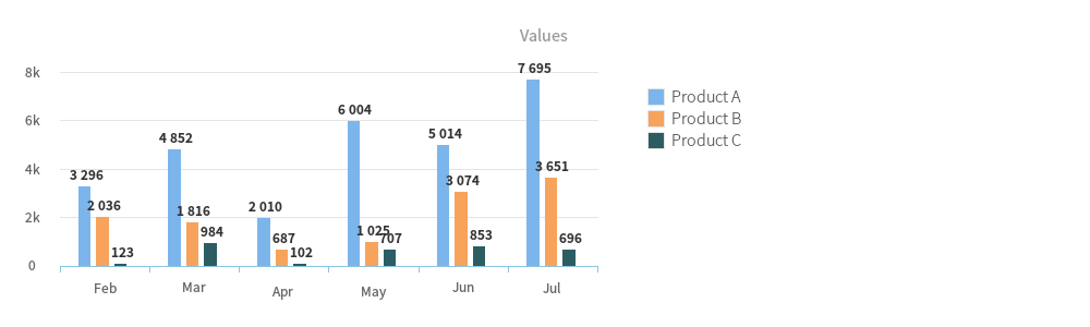use Phpopenchart\Chart\Column; $chart = new Column([ 'chart' => [ 'width' => 1000, 'height' => 300, ], 'title' => [ 'text' => 'Values' ], 'dataset' => [ 'series' => ['Product A', 'Product B', 'Product C'], 'labels' => ['Feb', 'Mar', 'Apr', 'May', 'Jun', 'Jul'], 'data' => [ [3296, 4852, 2010, 6004, 5014, 7695], [2036, 1816, 687, 1025, 3074, 3651], [123, 984, 102, 707, 853, 696], ] ] ]); $chart->render();