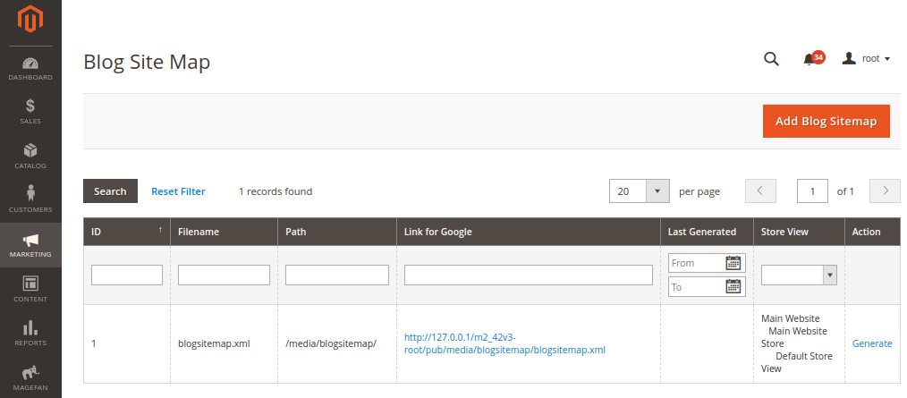 You can also go to Marketing > Seo & Search > Blog Site Map and generate a blog sitemap.