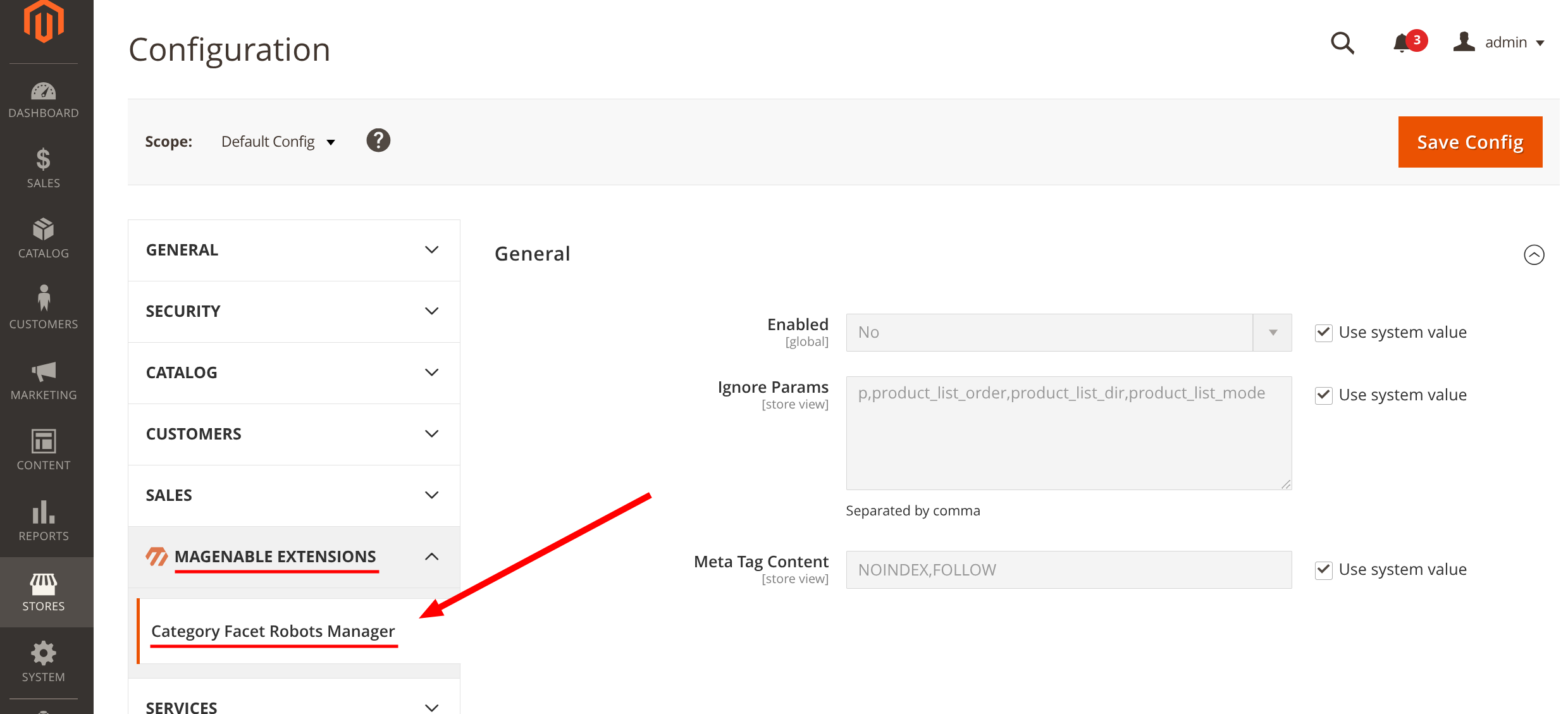 Go to Stores > Settings > Configuration > Magenable Extensions > Category Facet Robots Manager.