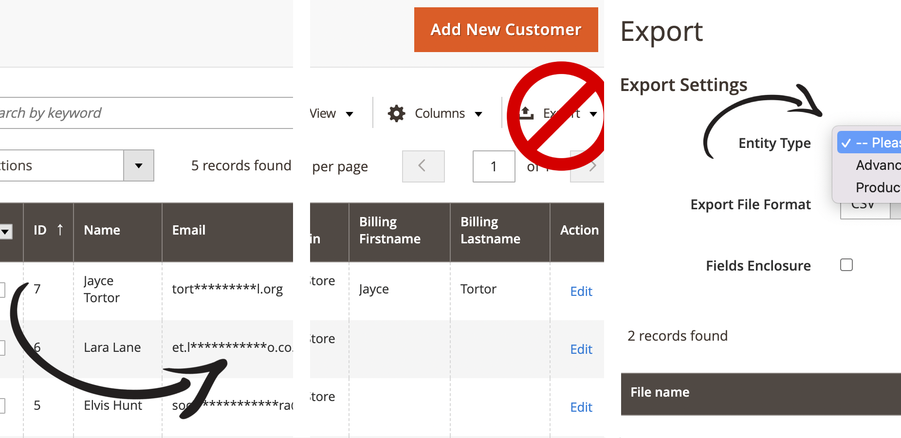 Disable all customer export functions and mask personal information such as email, phone number.