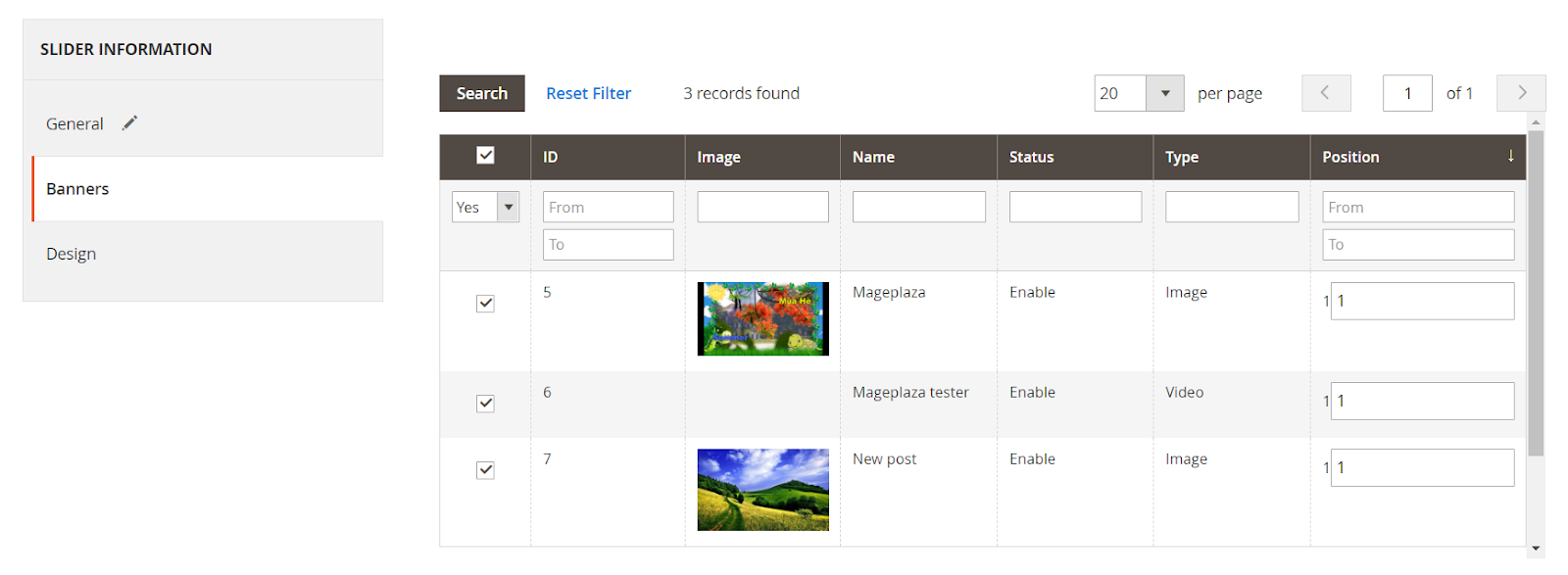 This section stores information about created Banner such as ID, Image, Name, Status, Type, Position. Here you can select an appropriate banner to show on Sliders.