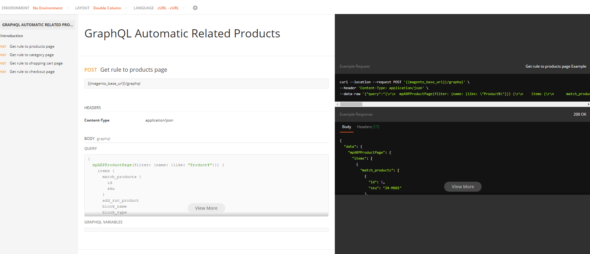 http://<magento2-server>/graphqlin url box, click Set endpoint. (e.g.http://dev.site.com/graphql) - To view the queries that the Mageplaza Auto Related Products GraphQL extension supports, you can look in
