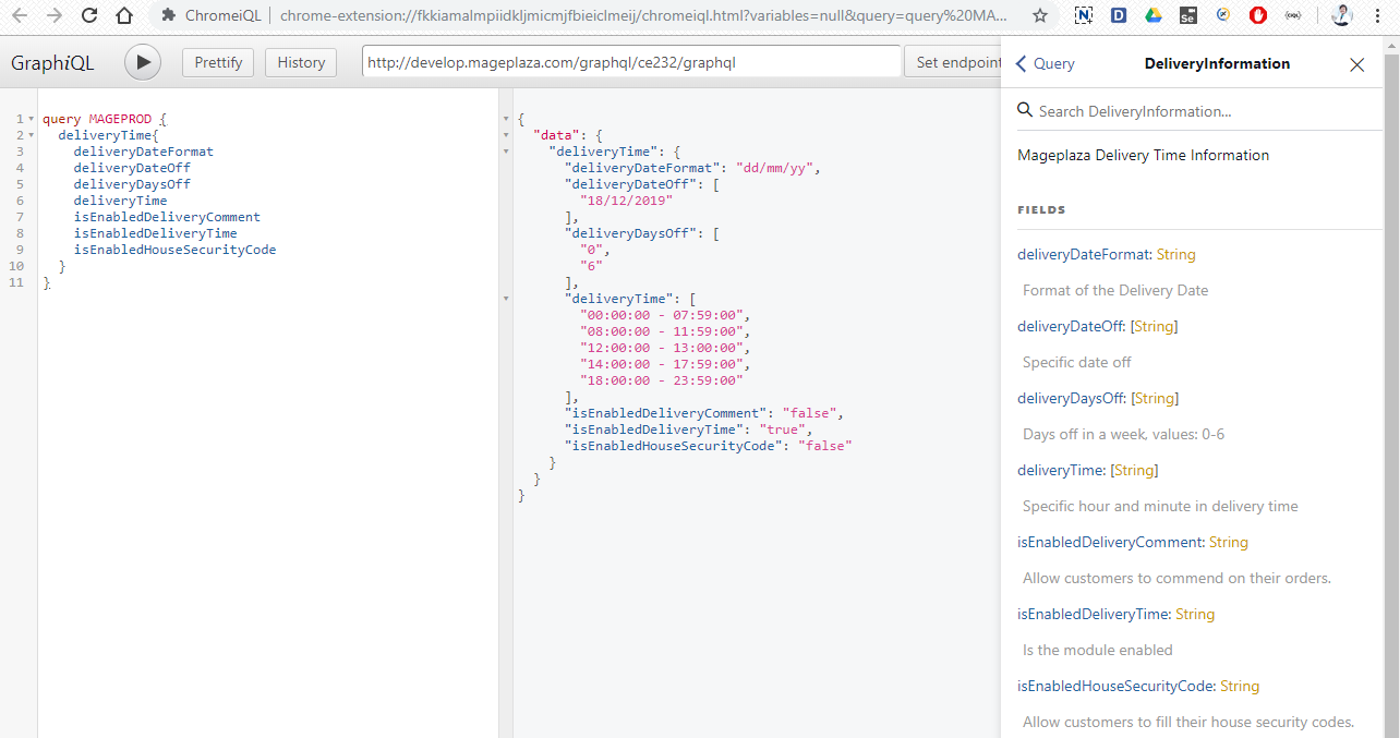 in url box, click Set endpoint. (e.g. http://develop.mageplaza.com/graphql/ce232/graphql) - Mageplaza-supported queries are fully written in the Description section of