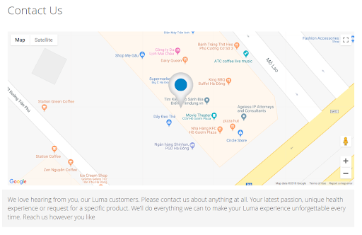 M2 Google Maps extension by Mageplaza allows stores to set the location on the web page. The Contact Us page with information about real location will make your site become more professional and reliable in the customer’s mind.