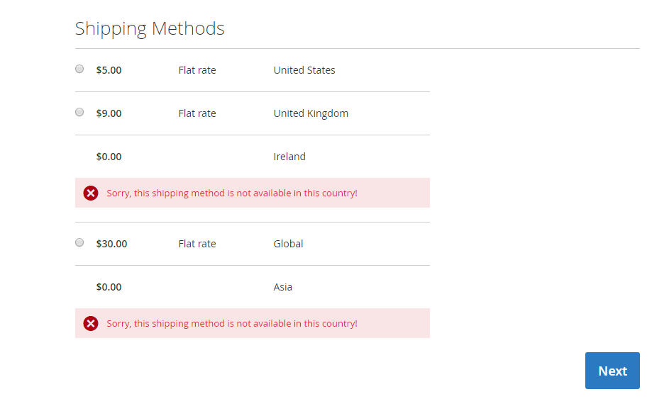 Buyers who are not in applicable countries will not be allowed to select that shipping flat rate. In this case, admins can set an error message to inform buyers. This message can be enabled/disabled and changed easily on the backend.