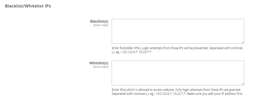 In the Blacklist field, in order to prevent strange IP addresses from abusing your backend login page, you can list those IPs in this field (multiple IPs or multiple IP ranges at a time). Now store admin can feel peace of mind, those blocked address cannot take further process to your store anymore.