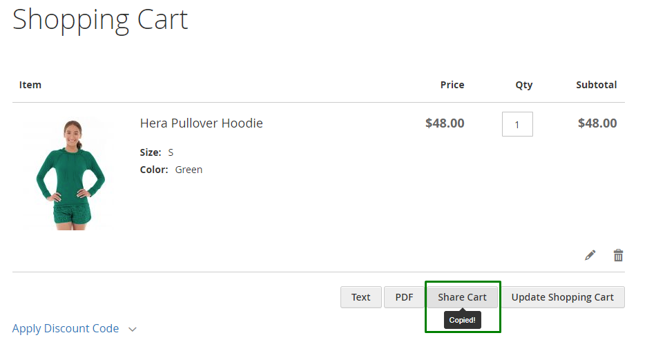 The button can be displayed in the Minicart section and Shopping Cart Page. By clicking this button, the customer can copy their shopping cart’ s URL and paste to a destination just in the blink of an eye. When the URL recipient clicks on the shared URL, their current shopping cart will be automatically added with the same items.