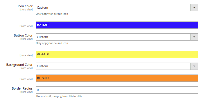A: From the admin backend, you can select the color for icon, button, and block background easily. Besides, you can upload the image as a button icon