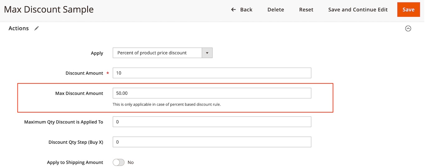 Magento 2 Discount Limiter allows setting the maximum discount amount (upper limit) for a percentage-based cart rule.