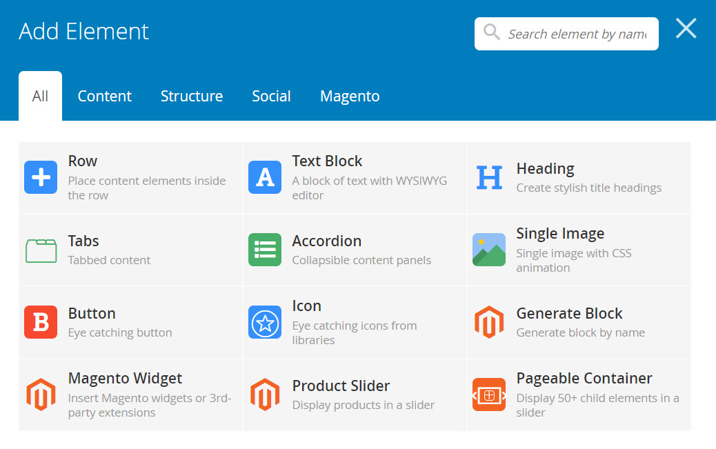 Our free page builder comes with 15 content elements, including Row, Section, Heading, Text Block, Empty Space, Separator, Button, Single Image, Icon, Tabs, Product Grid, Product Slider, Accordion, Generate Block, and Magento Widget.
