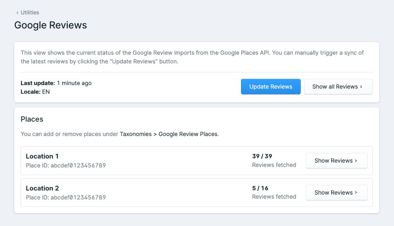 Additionally, you can see a list of all registered places. If a place ID is incorrect or if the reviews could not be fetched for some other reason, an error message will be displayed for the place. You can also see how many reviews are locally stored for each place and how many reviews are actually available on Google (see Known Issues).