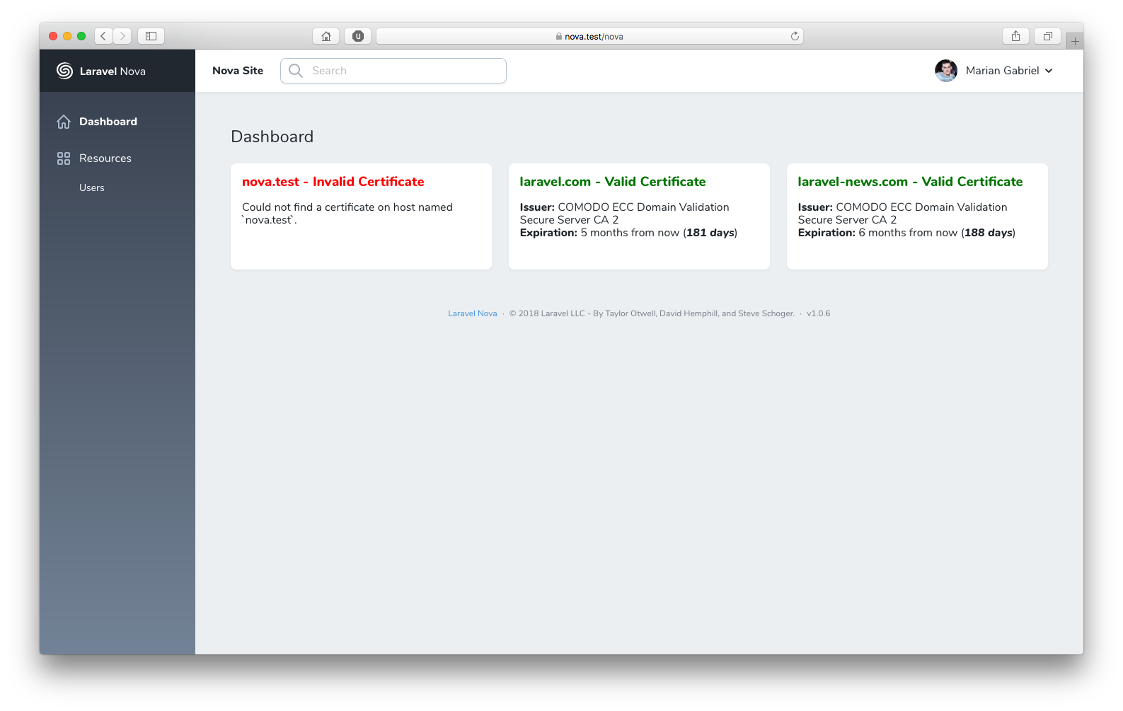 // in app/Providers/NovaServiceProvider.php // ... public function cards() { return [ new \Marianvlad\NovaSslCard\NovaSslCard, // current domain // or new \Marianvlad\NovaSslCard\NovaSslCard('laravel.com'), ]; }