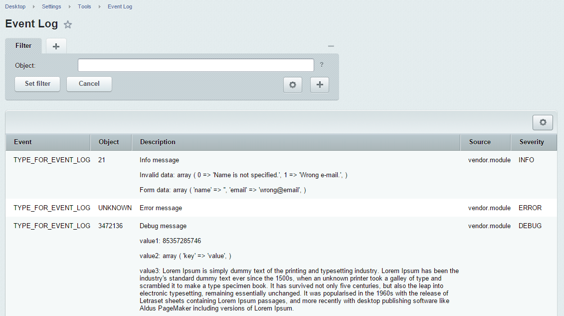 <?php use Monolog\Registry; $logger = Registry::getInstance('feedback'); // Write info message with context: invalid message from feedback $logger->info('Failed create new message on feedback form', array( 'item_id' => 21, 'Invalid data' => $addResult->getErrorMessages(), // error savings 'Form data' => $formRequest // data from feedback form ));
