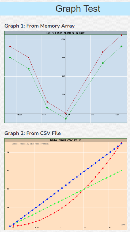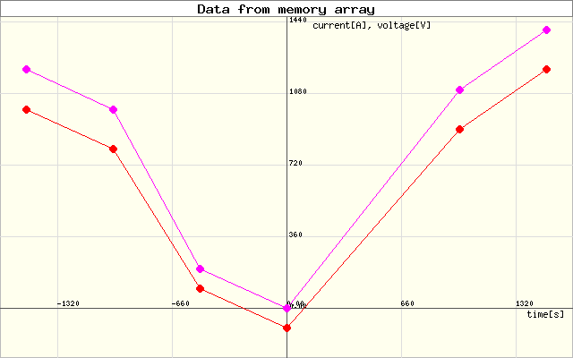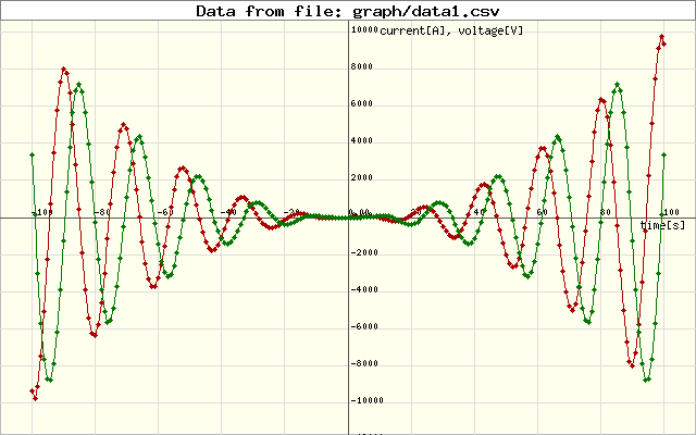 $csvFile = new CsvFileReader('data.csv', ","); // create the CSV file reader $datasets = $csvFile->getDataSets(); // get the data sets $datasets[0]->setMarker(5, '#a00'); // set marker radius and color $datasets[1]->setMarker(5, '#070'); $frame = new Frame(640, 400); // create the frame $axis = (new AutoAxis($datasets, $frame )) // create the axis ->addLabels('time[s]', 'current[A], voltage[V]') ->setGrid(200, 100); ->addTitle('Current and voltage vs time'); (new Graph($axis)) ->addDataSets($datasets) // add the datasets to the graph ->render()->save('graph/testgraph.png'); // save the graph to a file