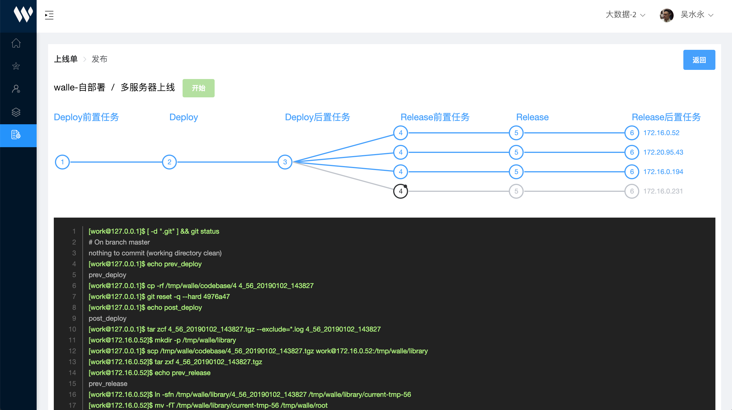 walle 让用户代码发布终于可以不只能选择 jenkins!支持各种web代码发布,php、java、python、go等代码的发布、回滚可以通过web来一键完成。walle 一个可自由配置项目,更人性化,高颜值,支持git、多用户、多语言、多项目、多环境同时部署的开源上线部署系统。