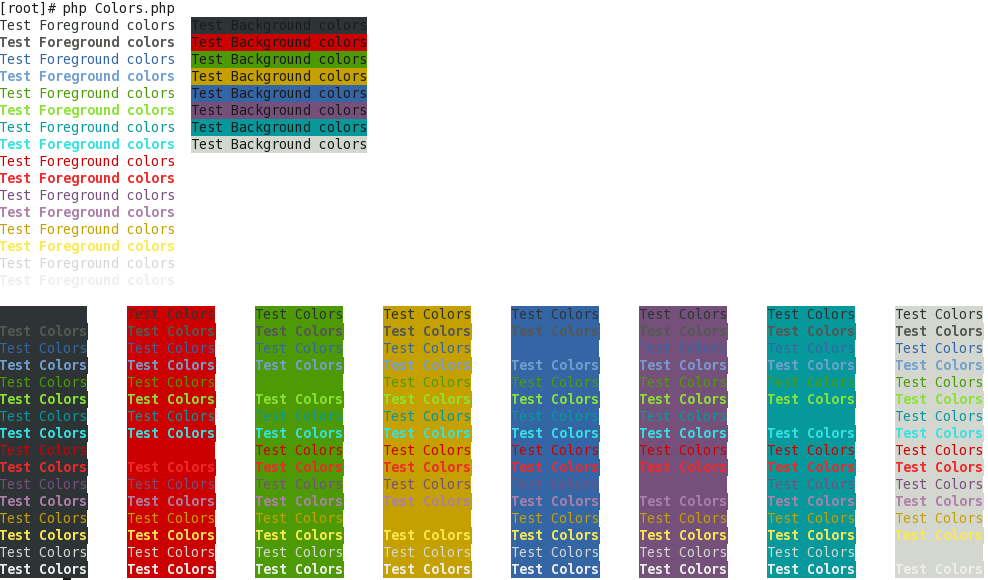<?php use cliColor\cliColor; $colors = new cliColor(); echo $colors->setColor("Testing", "purple", "yellow")