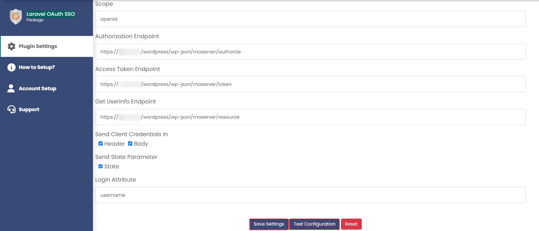 Use your OAuth Provider details like Client ID and Client Secret to configure the plugin. After that, you can enter the Scope, Authorization Endpoint, Access Token Endpoint, GetUserinfo Endpoint, Realm, Domain, Tenant (as per your OAuth Provider or use the default ones provided already). You can send the client credentials in header or body and also send state parameter accordingly.