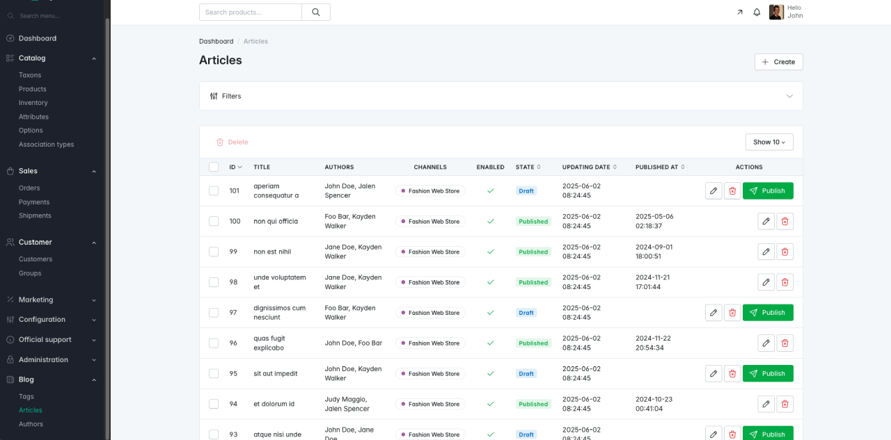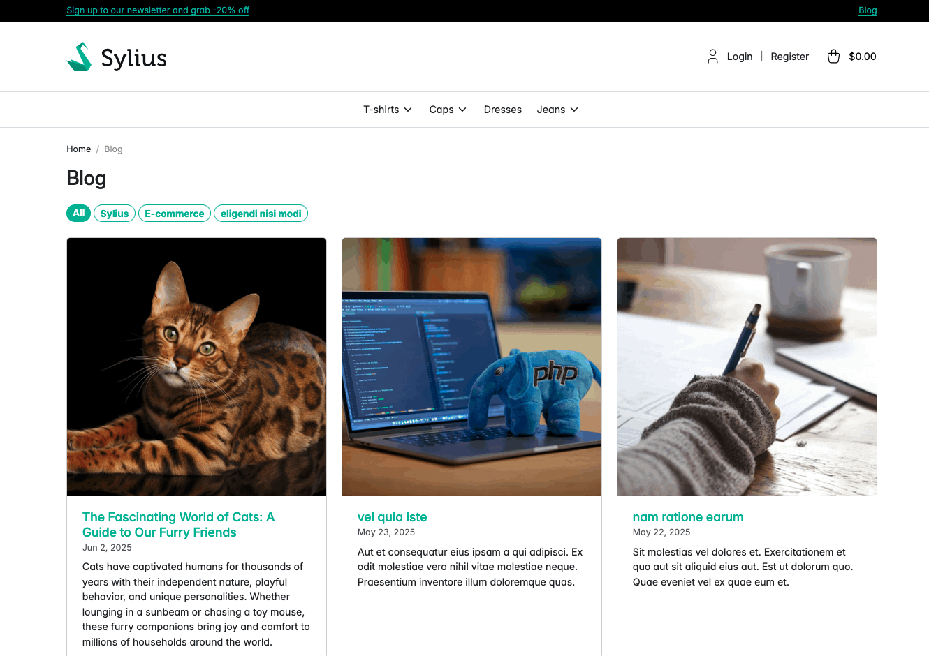 This plugin adds a blog to your Sylius project. It allows you to create blog articles, tags and authors.