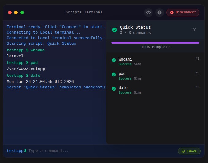- Scripts: Define reusable command sequences with progress tracking and one-click execution