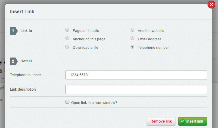 Adds a telephone number option to TinyMCE's Insert Link dialog for creating/editing tel: links.