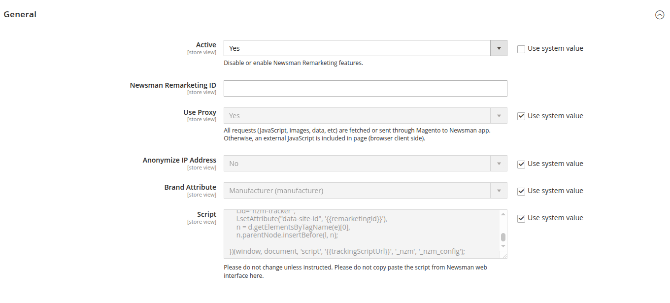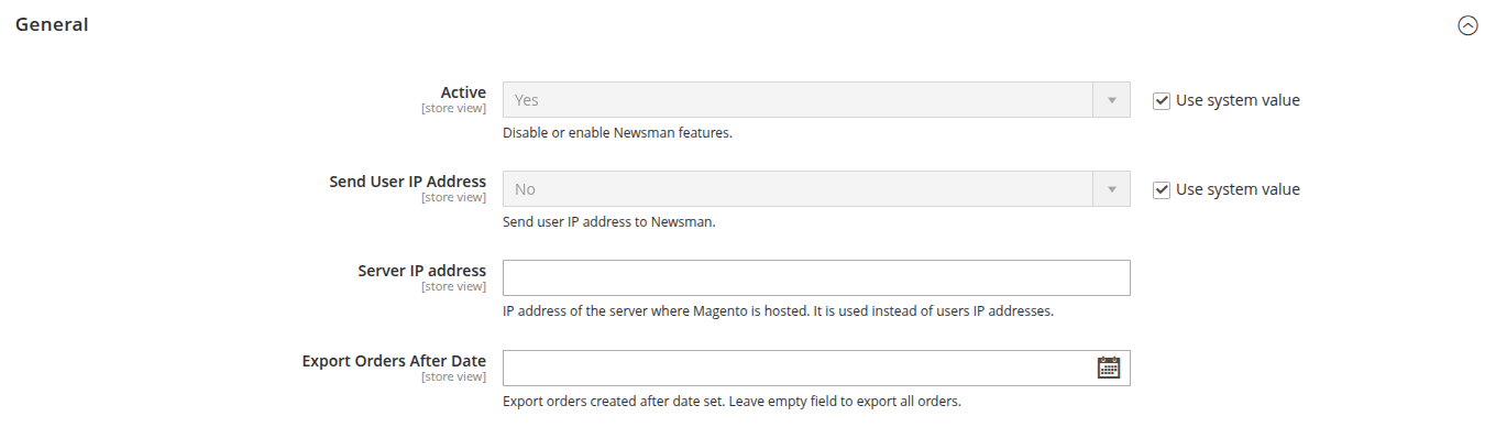 - Set "Send User IP Address" to yes. If not, please set the Magento server IP address. The IP address is used in Newsman API operations.
