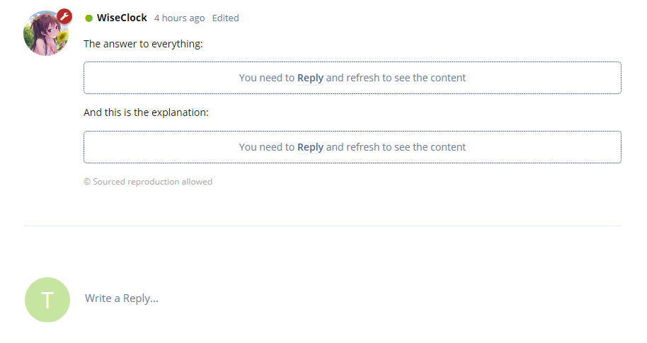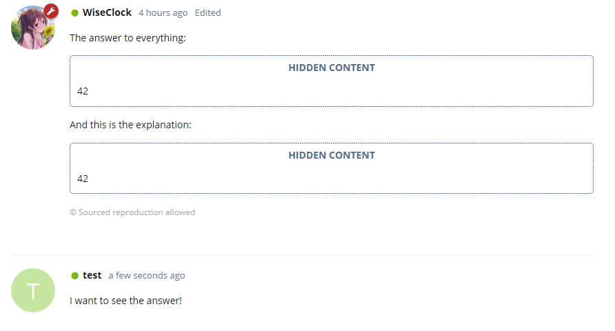 Note that it only works for the main post (the start post of a discussion) because I don't think it makes sense to ask people replying to a comment post to see it's content. This BBCode will be replaced by div in comment posts.