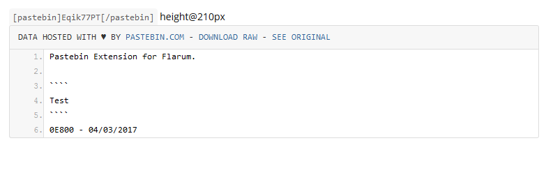 Embeds the paste into the Flarum post. Respects the exposure and expiration settings for the paste. A notice is provided if the paste expires (or is deleted) or if the paste is private. Displays the proper formatting when syntax highlighting is used.