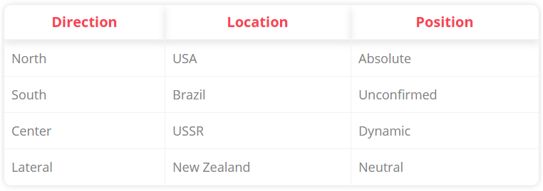 [lr35]Direction, Location, Position, North, USA, Absolute,South, Brazil, Unconfirmed, Center, USSR, Dynamic, Lateral, New Zealand, Neutral[/lr35]