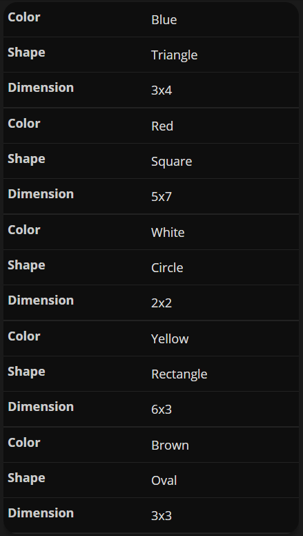 [tr36]Color,Shape,Dimension,Blue,Triangle,3x4,Red,Square,5x7,White,Circle,2x2,Yellow,Rectangle,6x3,Brown,Oval,3x3[/tr36]