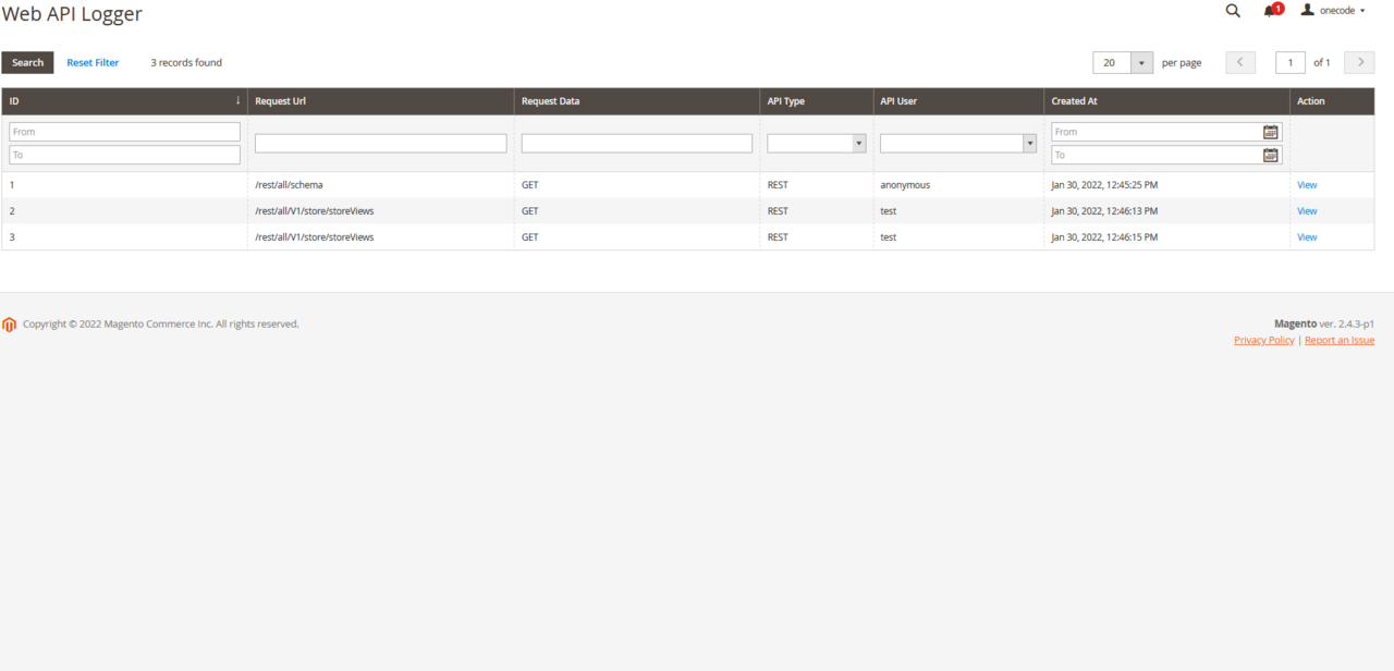 Login to the Magento Admin, navigate to Store > Configuration > Onecode Extensions > Web API Logger