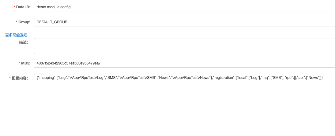 // 配置模块映射(demo) 'mapping' => [ 'Log' => '\\App\\RpcTest\\Log', 'SMS' => '\\App\\RpcTest\\SMS', 'News' => '\\App\\RpcTest\\News', ] // 注册模块(demo) 'registration' => [ 'local' => ['Log'], 'mq' => ['SMS'], 'rpc' => [], 'api' => ['News'], ] // 配置服务地址(demo) 'hosts' => [ 'Log' => '127.0.0.1', 'SMS' => '127.0.0.1,127.0.0.2', 'News' => '127.0.0.3' ]