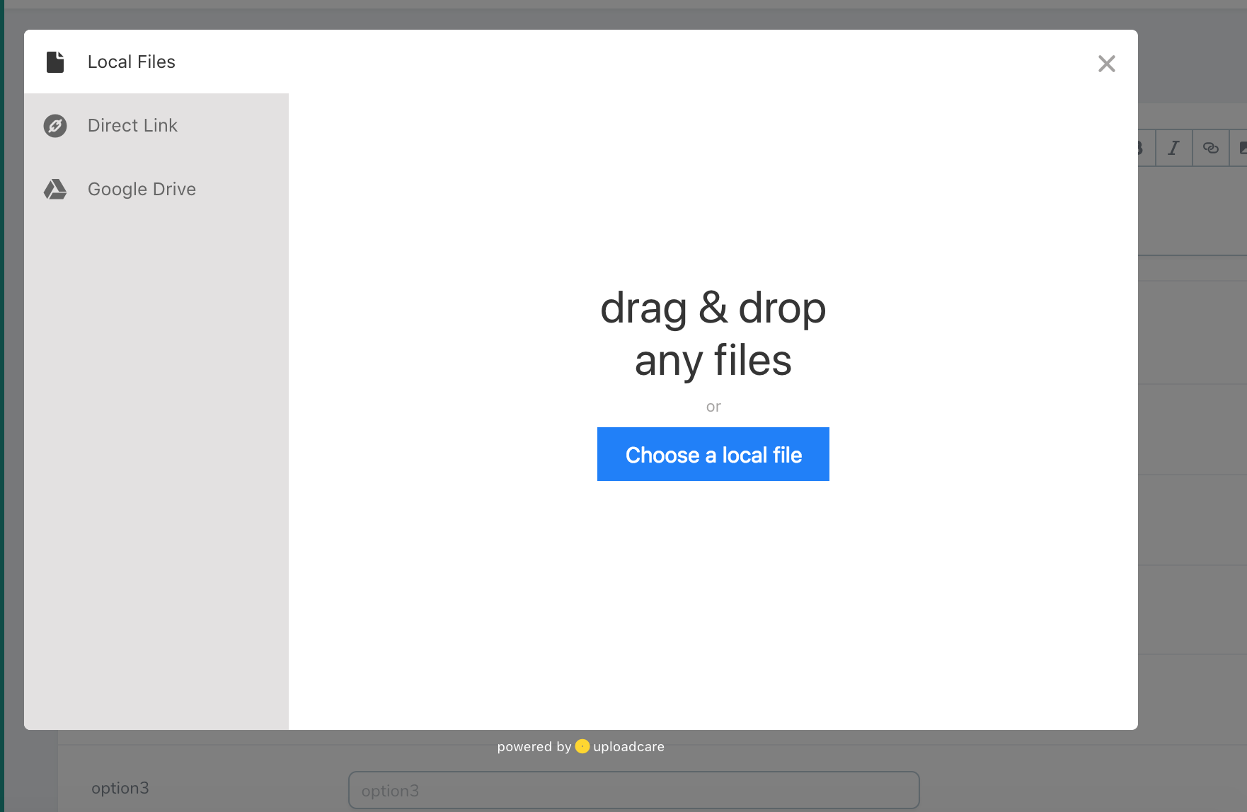 You can upload an image through drag-and-drop, url or google drive. The image is stored on Uploadcare and saved as a url in the model.