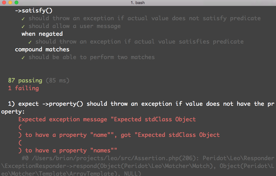 Leo matchers generate detailed error messages for failed assertions: