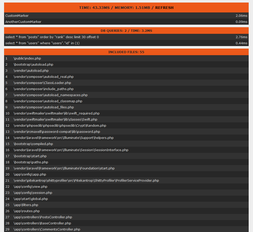 A shitty profiler for Laravel. It only shows some quick and dirty stats, but it's unobtrusive and easy to configure.